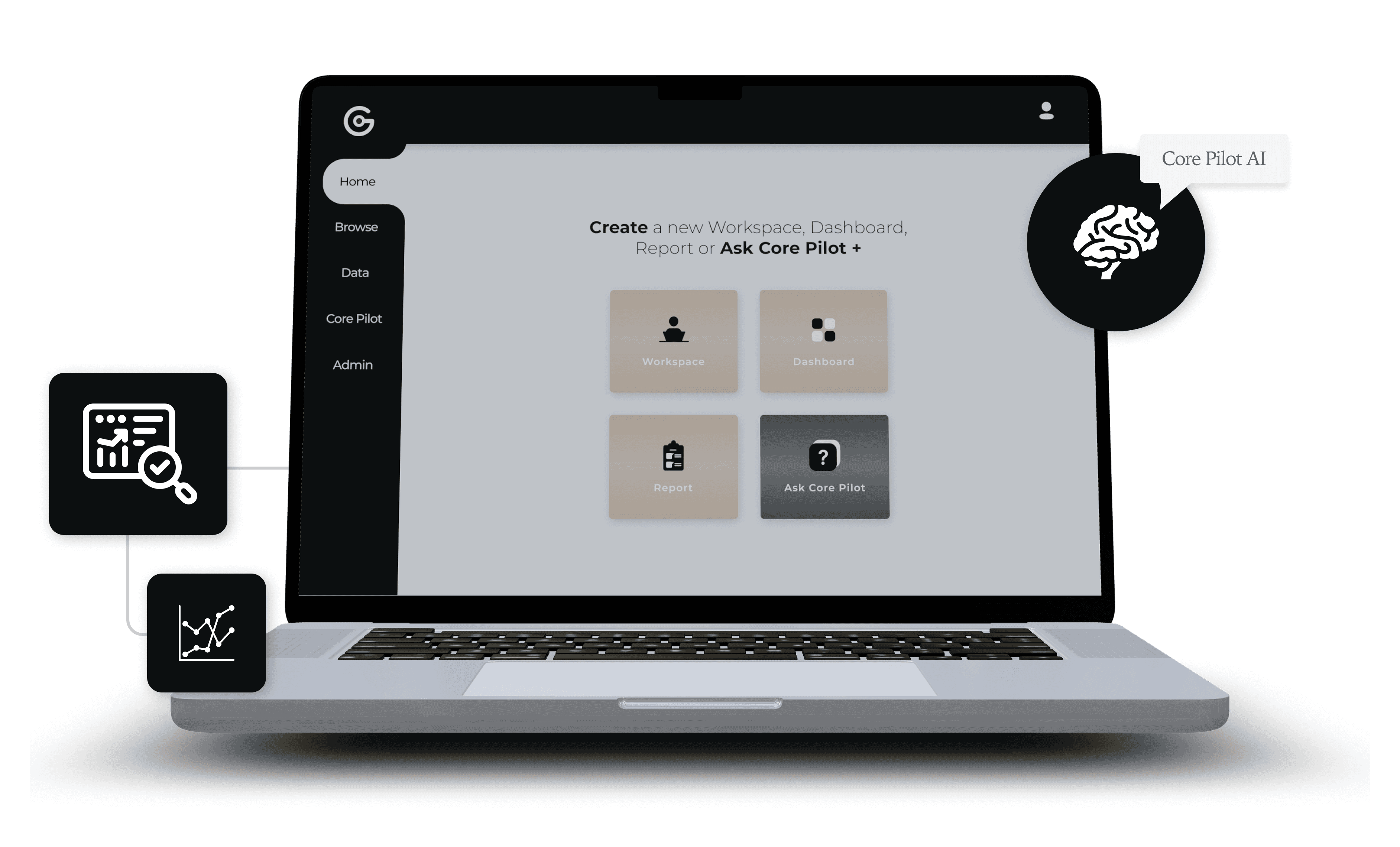 The Intelligence (CorePilot): Users are met with a conversational interface. This allows them to define the report’s scope by simply asking, "Show me churn rates by region for Q3."