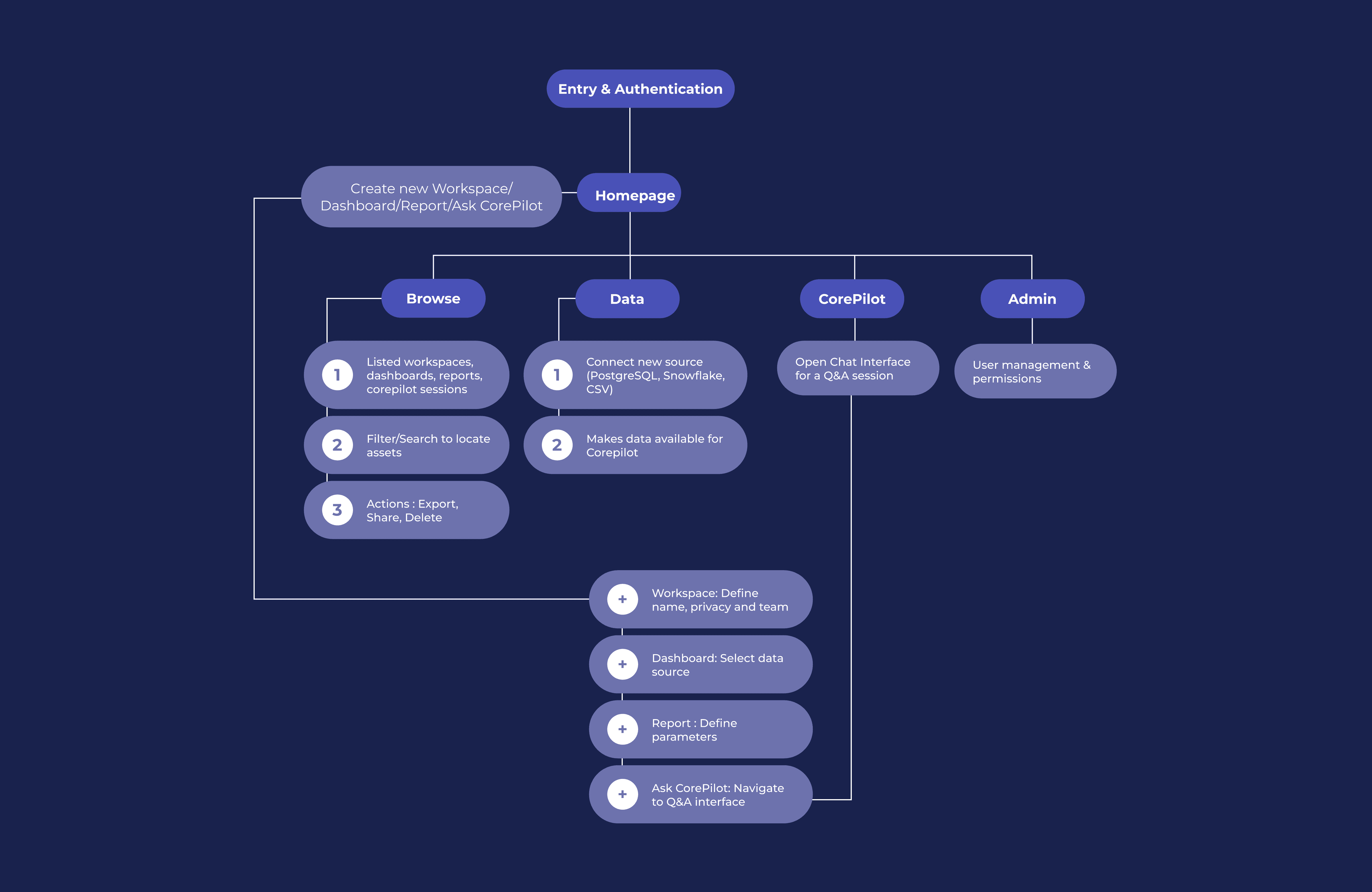 In traditional BI tools, creating a report is a multi-step, technical process involving data joining, filtering and visualization mapping. For Coresight AI, I designed a flow that prioritizes natural language entry as the shortcut to complex reporting.