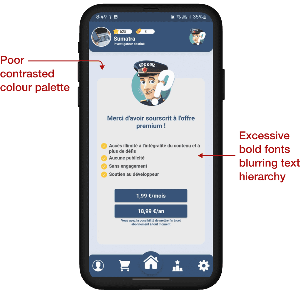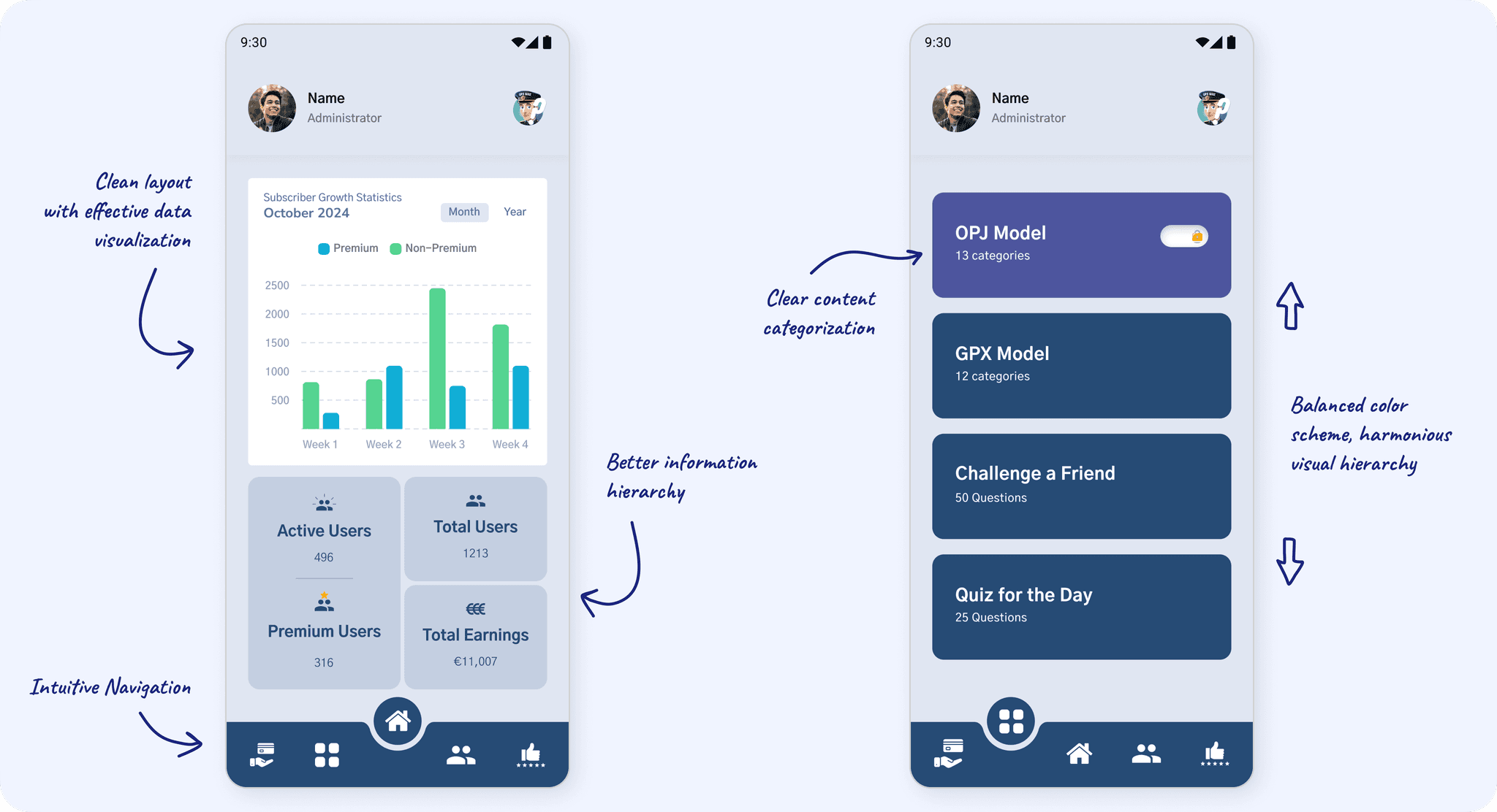 To ensure the admin panel design met the client’s expectations, I conducted informal usability testing. The client interacted with a clickable prototype of initial wireframes during multiple iterations, offering direct feedback. This highlighted certain pain points, such as the complexity of navigating through subscription management and the need for clearer visual indicators for premium questions. Based on this input, I made the following changes: