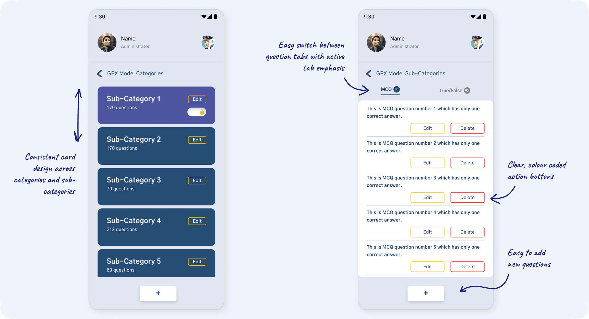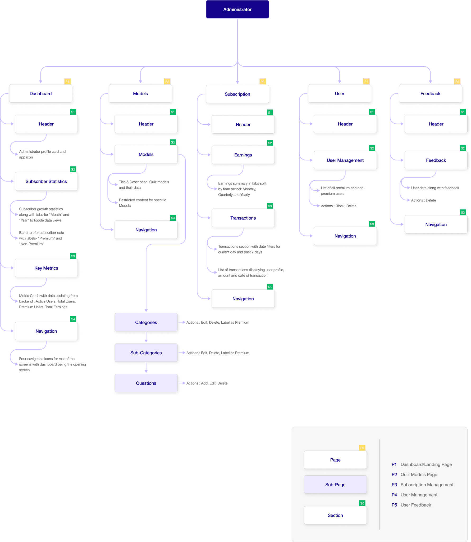 I began with an initial blueprint, reimagining the admin panel, focusing on the app's core functionalities as per client’s requirements, particularly the question management feature. Key aspects included: