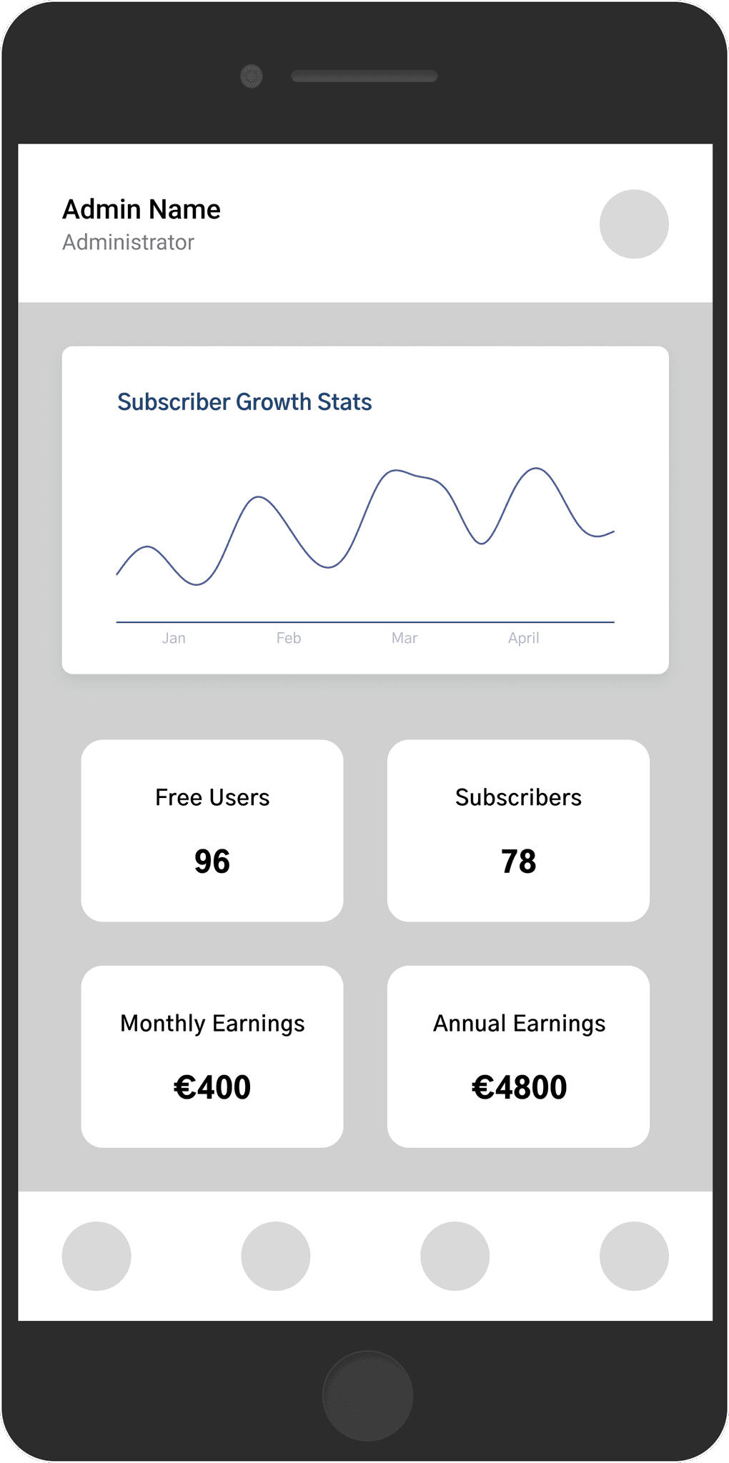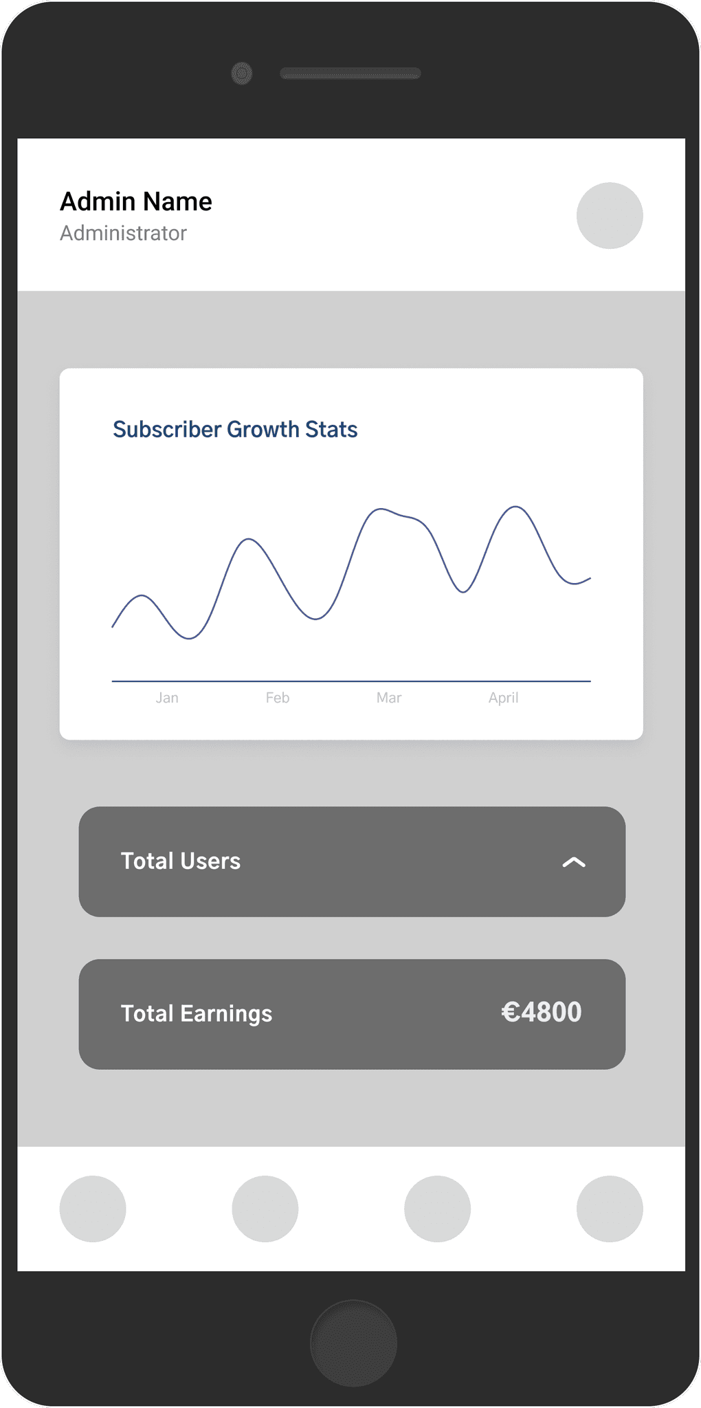 Subscription statistics, key metrics like total users, active vs. inactive subscriptions, & monthly earnings.